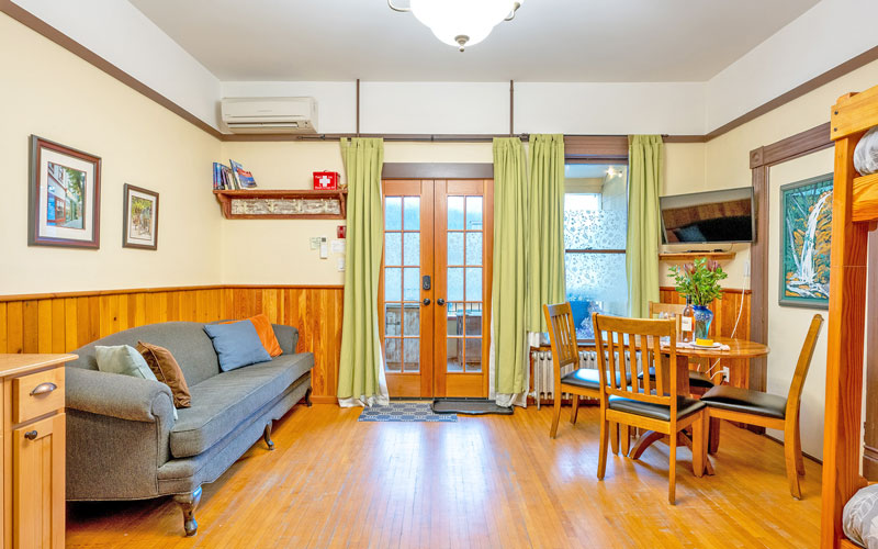 This spacious 1 bedroom suite is located on the main level of the Inn. It includes one bedroom with one queen bed, one bathroom with a shower, and the main room with a kitchen, dining table, sofa, and a set of single bed sized bunk beds. The french doors off this suite open from the main room onto the verandah where there is outdoor dining furniture. Comfortably sleeps 4 people.